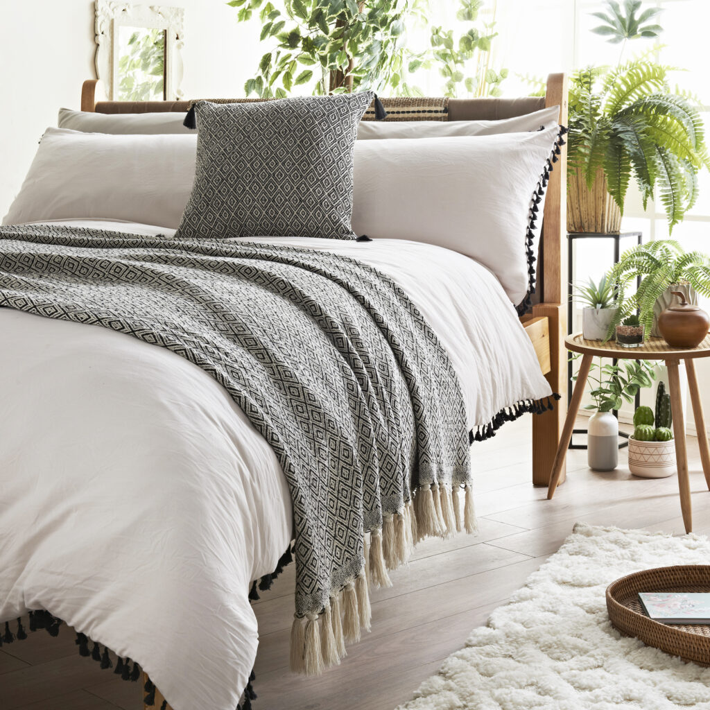 The Cosmo Living Geometric Print Tassel Cushion and Throw is boho glam with a modern twist, perfect for making a statement in your bedroom.