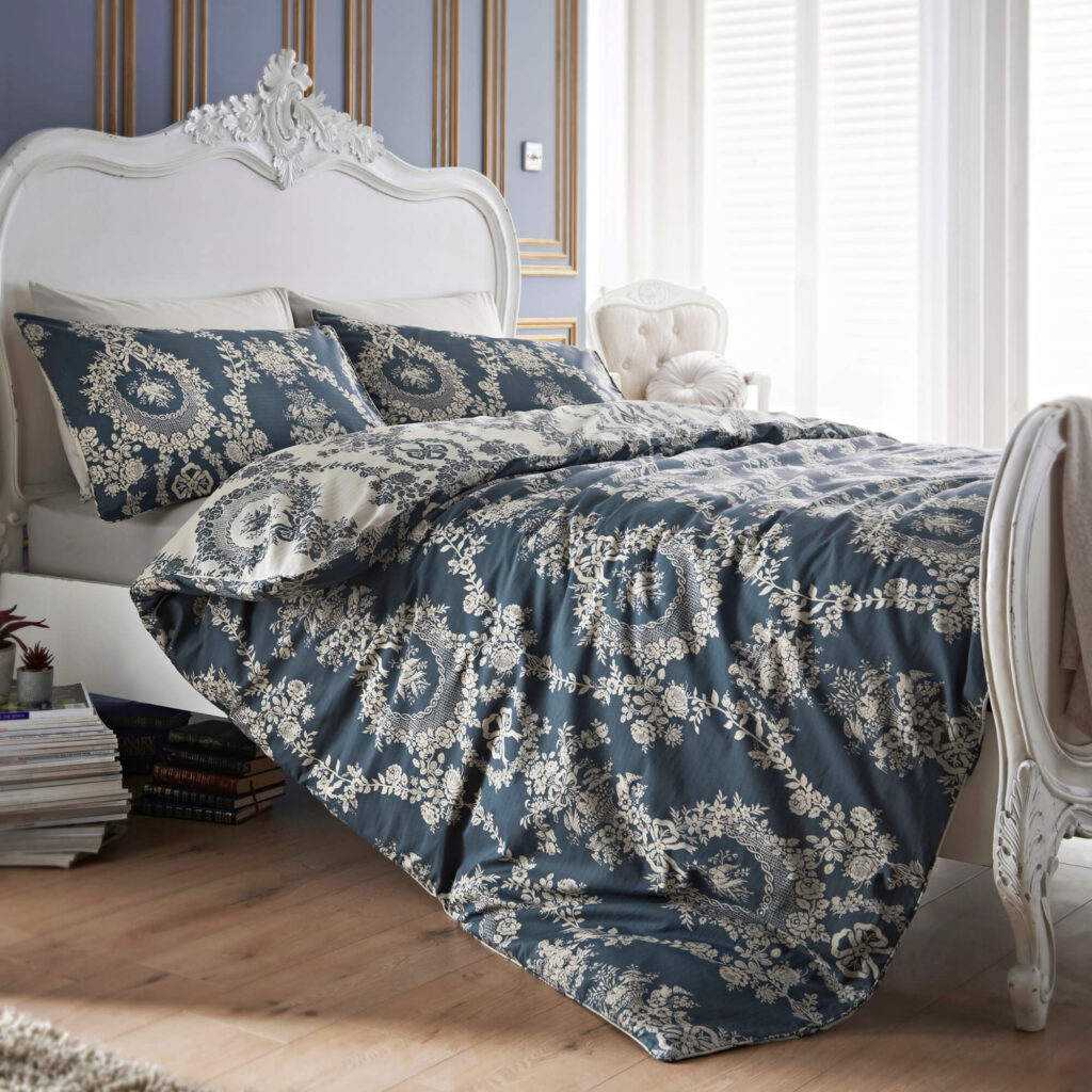 Add a touch of comfort and style to your bedroom with this beautiful duvet set from Jeff banks Pour La Maison range. The Chateau duvet set features a delicate floral paisley design in navy and natural colourways with an inverted pattern reverse so you have an option to change the look of your room. The soft to the touch natural cotton material is breathable, keeping you cool and allowing your skin to breathe for a blissful night’s sleep.
