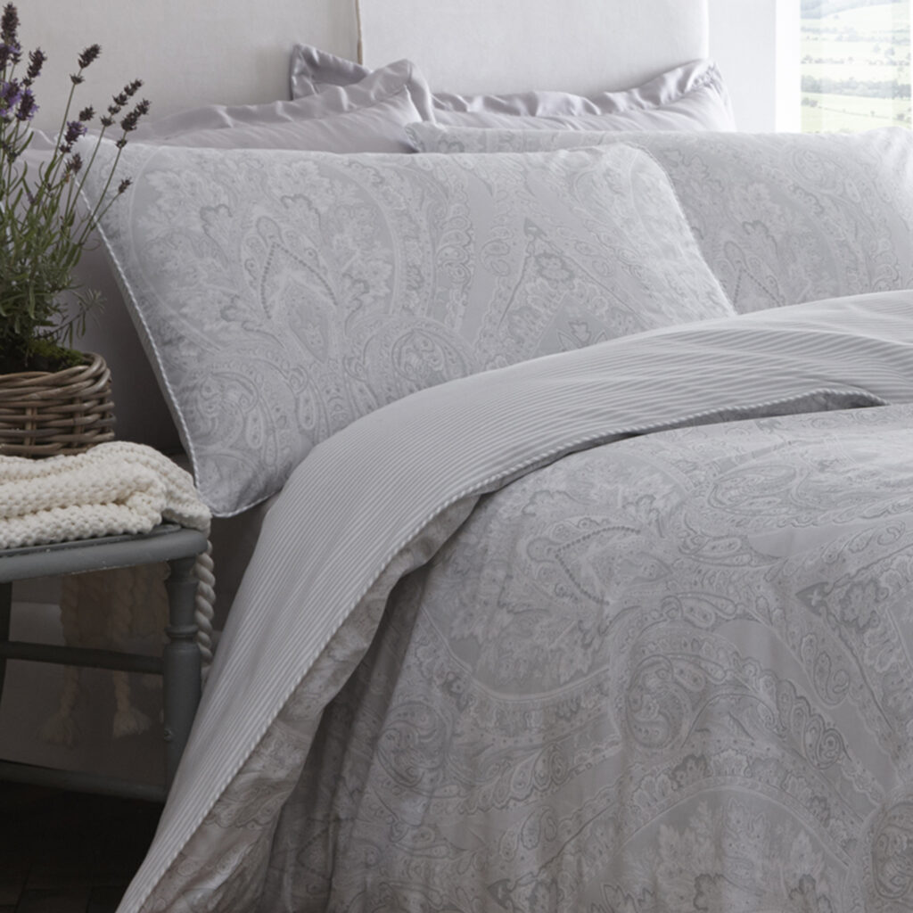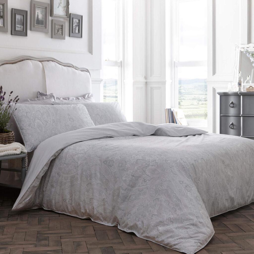 Add a touch of comfort and style to your bedroom with this beautiful duvet set from Jeff banks Pour La Maison range. The Toulouse duvet set features an elegant paisley design in silver with striped reverse pattern giving you an option to change the look of your room. The soft to the touch natural cotton material is breathable, keeping you cool and allowing your skin to breathe for a blissful night’s sleep.