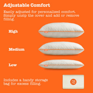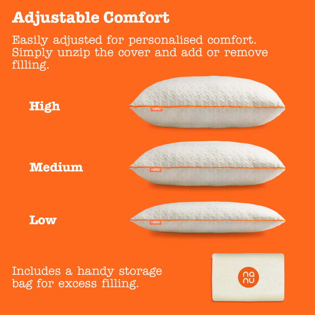 - ADJUSTABLE COMFORT: We understand that everyone sleeps differently, which is why the Nanu Adjustable Memory Foam Pillow can easily be adjusted to suit your needs. Whether you sleep on your side, back or front, filling can be added or removed to achieve your ideal pillow height.