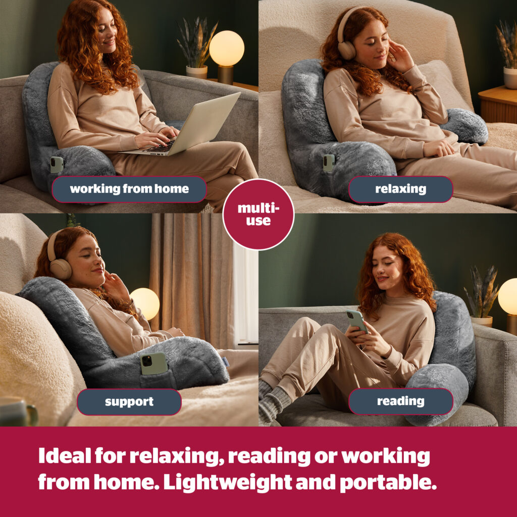 The Cuddle Pillow is the ideal companion when working from home and is great for people who spend long hours sitting down. The pillow can be easily moved around the home and can be used when reading, working from home, gaming or general relaxation.