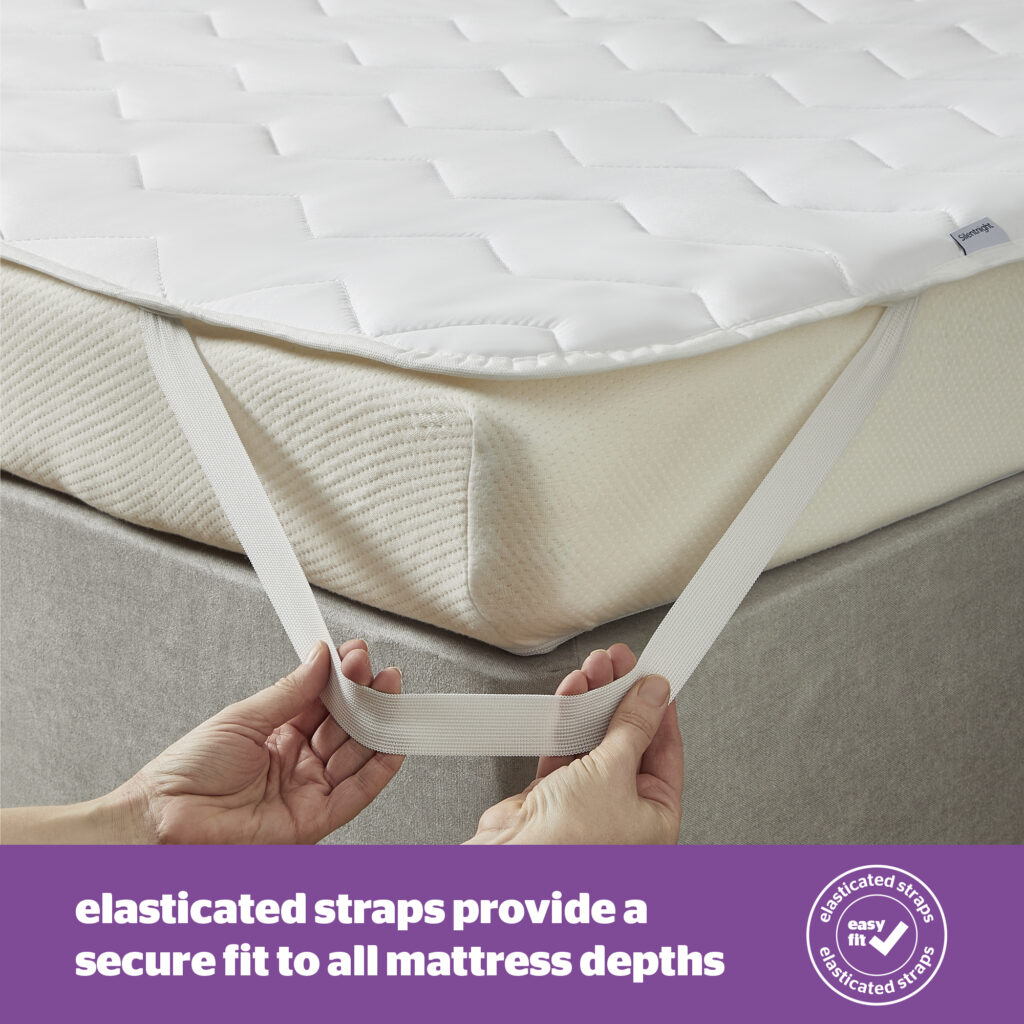 The Silentnight Deep Sleep Mattress Protector has been designed to protect and prolong the life of your mattress, helping to shield spills, stains and general wear and tear. The soft touch quilted cover is generously filled with soft and comfortable hollowfibre which helps to add an extra layer of cushioned comfort to your mattress. The elasticated straps are easy to fit and are designed to cover all mattress depths to help keep the protector firmly in place.