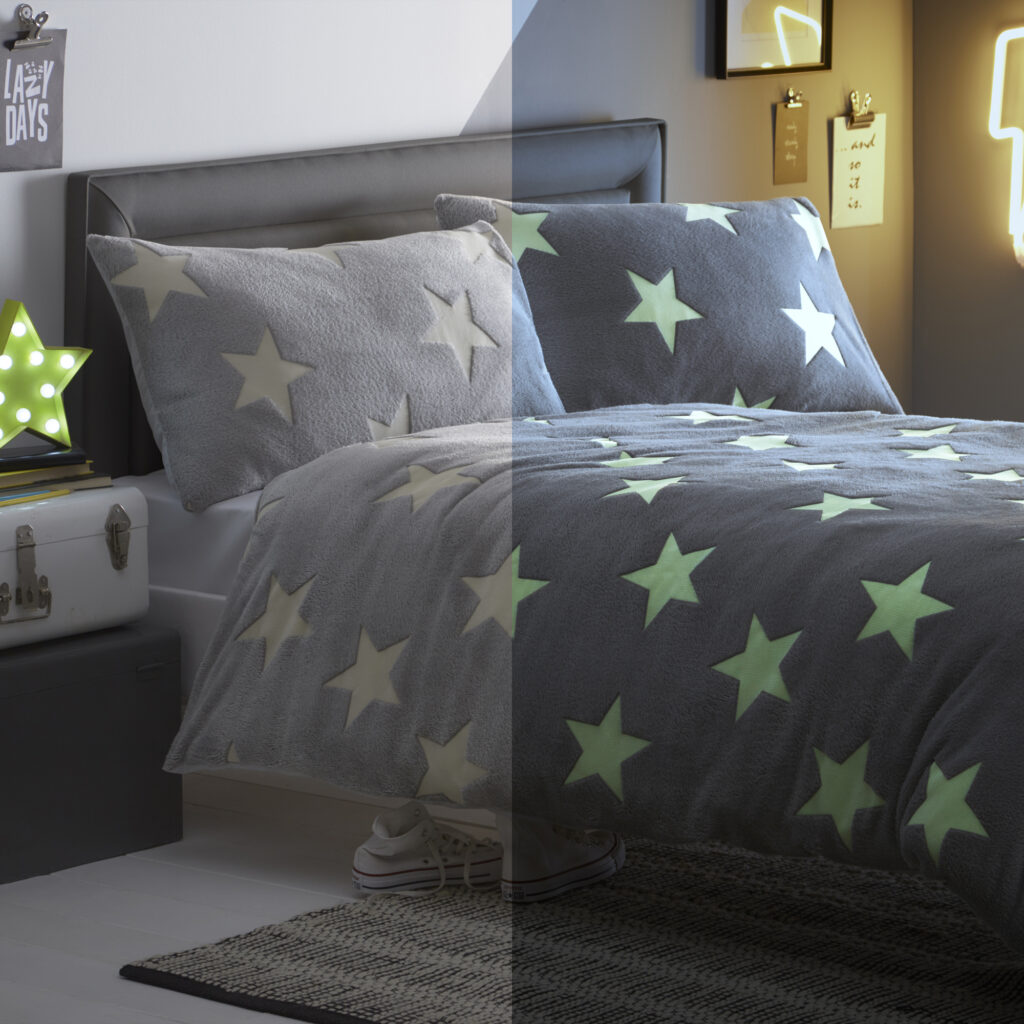 - OUT OF THIS WORLD DESIGN: This supersoft duvet comes alive in the dark! Glowing stars and moons create a magical scene to enjoy whilst you drift off to sleep.
