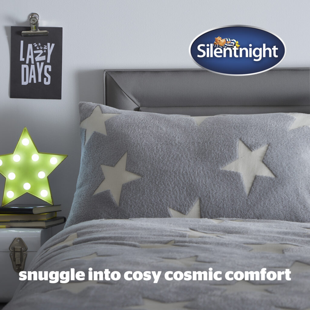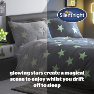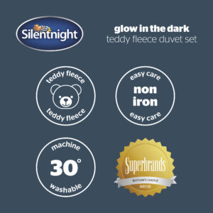 Snuggle into cosy cosmic comfort each night with the Silentnight Glow in The Dark Teddy Fleece Duvet set. This supersoft duvet comes alive in the dark! Glowing stars and moons create a magical scene to enjoy whilst you drift off to sleep. Pair with our teddy fleece fitted sheet for extra comfort.