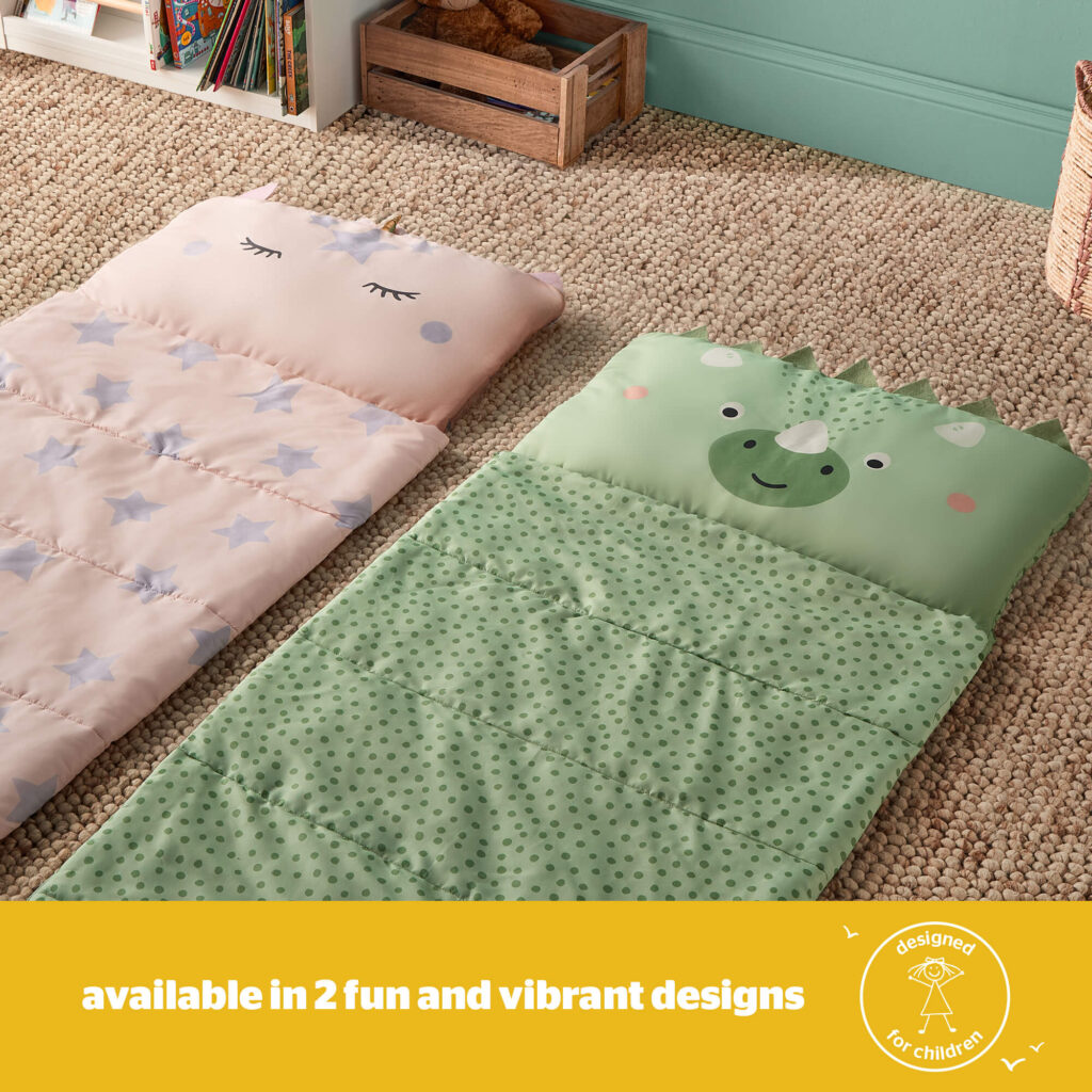 Drift off to dreamland with the Silentnight Healthy Growth All-in-one Sleepover Bag. Combining a sleeping bag and built-in pillow for comfort and convenience. Available in 2 fun and vibrant designs; dinosaur and unicorn.
