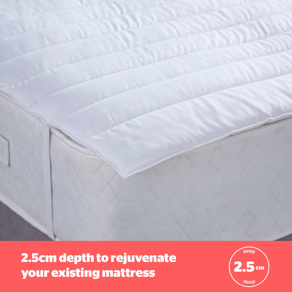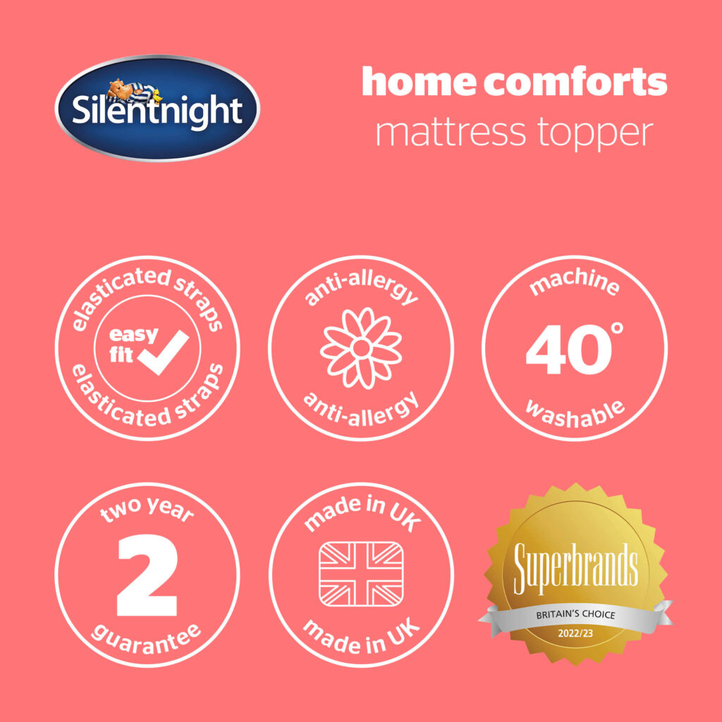 The Silentnight Home Comforts Mattress Topper is soft and cosy for unbeatable home comfort, wherever you are. Filled with anti-bacterial fibres that actively protect against bacteria and dust mites, keeping your bed fresh and hygienic for longer. Reduces and remove allergens, helping you to enjoy a restful sleep.
