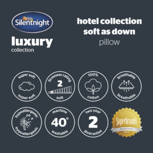 Indulge in the 5-star comfort of a hotel every night and sink your head into luxury with the Silentnight Hotel Collection Soft as Down Pillow. Featuring sumptuously soft 100% fine microfibres for a down-like feel and a breathable 100% cotton cover for added breathability. This is the perfect alternative to feather and down, especially for those with allergies, providing a wonderfully luxurious feel that is completely hypoallergenic.