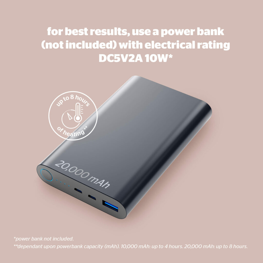 Including a 30cm USB Cable for easy connection to a power bank (not included. For best results use a power bank with electrical rating DC5V2A 10W*) and featured a neat pocket to store them both in. The blanket is also machine washable for continued freshness use after use.