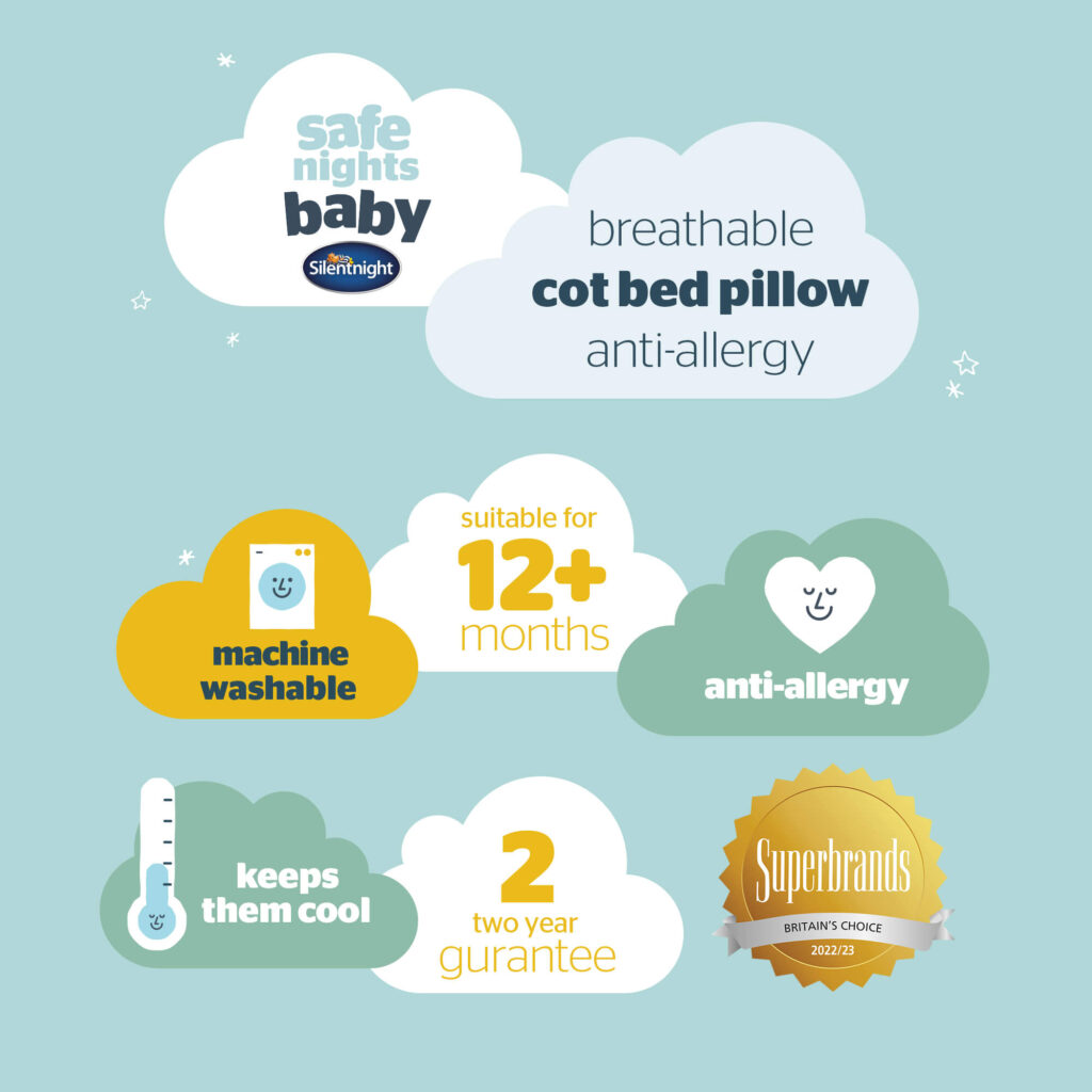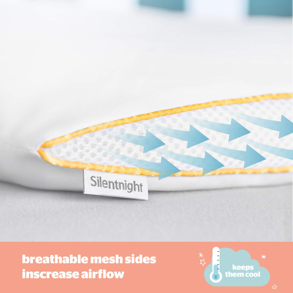 The Safe Nights Breathable Anti-allergy Cot Bed Pillow by Silentnight offers breathable comfort for your baby. Designed with unique mesh sides which help to increase airflow for a comfortable and fresh sleeping environment.