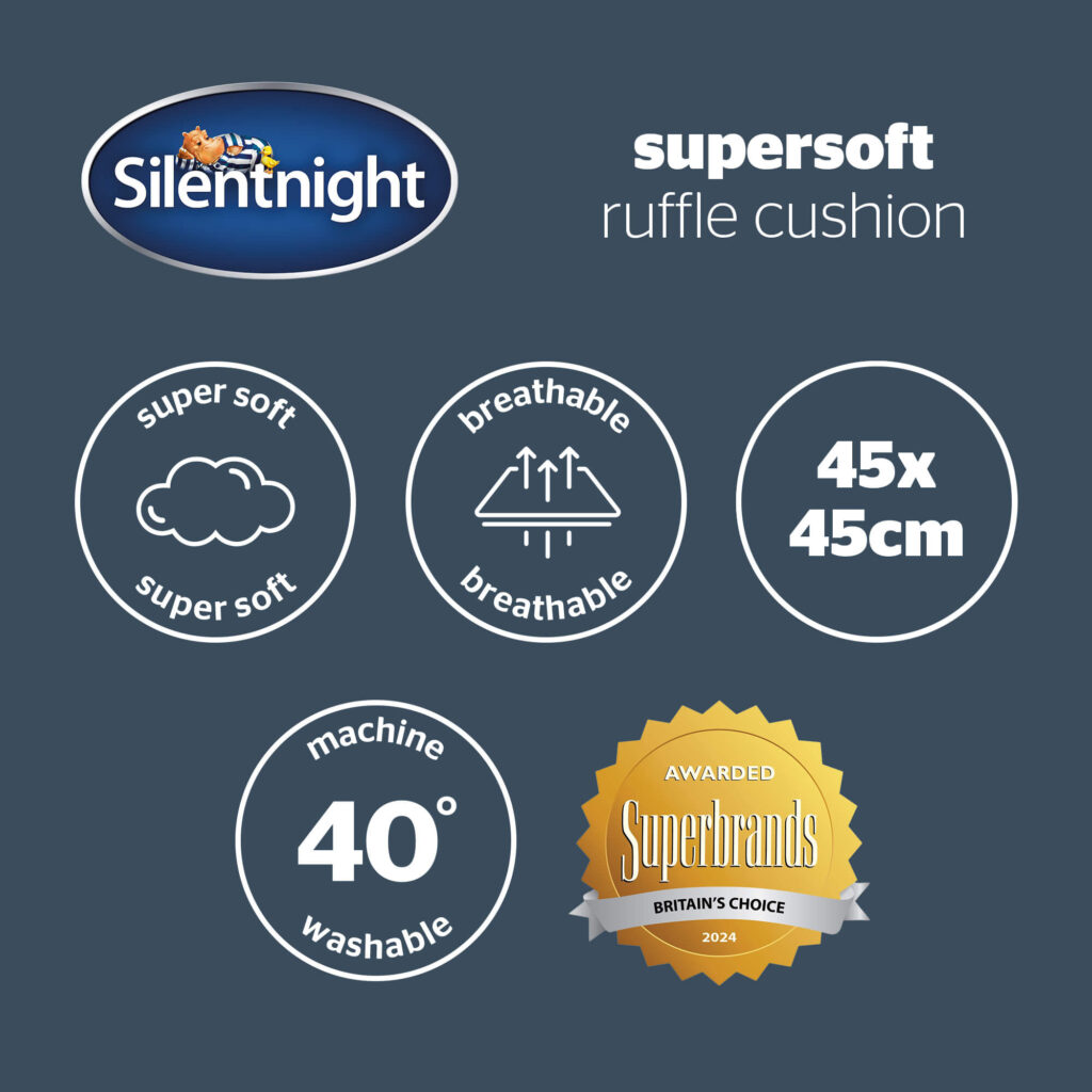 The Silentnight Supersoft Ruffle Cushion is exquisitely stylish and elegant to add the perfect finishing touch to your bedroom. The soft textured material is beautifully crafted from 100% microfibre which is soft to the touch offering ultimate comfort and enhancing any setting with its refined look. Available in 2 stylish trend-led colours – natural & sage.