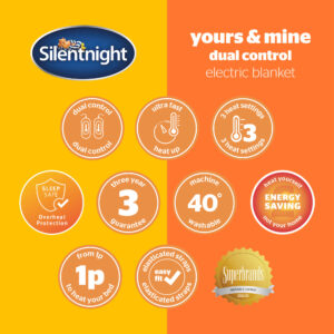 The Silentnight Yours & Mine Electric Blanket is an energy efficient and affordable way to stay warm for less. Pre- heating your bed for 1 hour on a low heat setting costs from as little as 1p, so you can afford to cosy up night after night. As sleep experts we recommend turning off the appliance before falling asleep to regulate your core temperature for a less disturbed sleep.