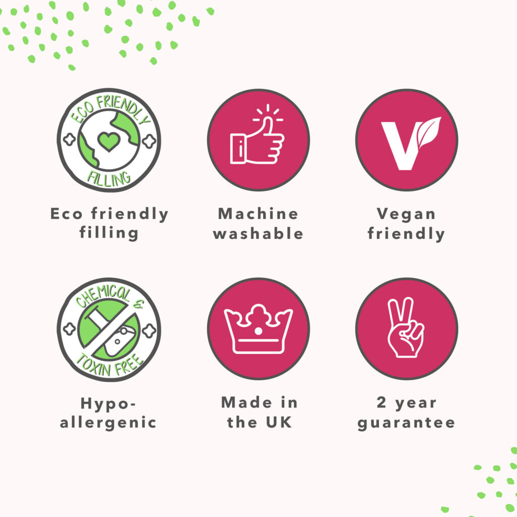 We’ve got you; your bedding is filled with 100% recycled content giving our lovely planet a helping hand. We care so you can be carefree, the squidgy fibres were once plastic bottles that have enjoyed a wonderful makeover. We haven’t compromised on comfort either.