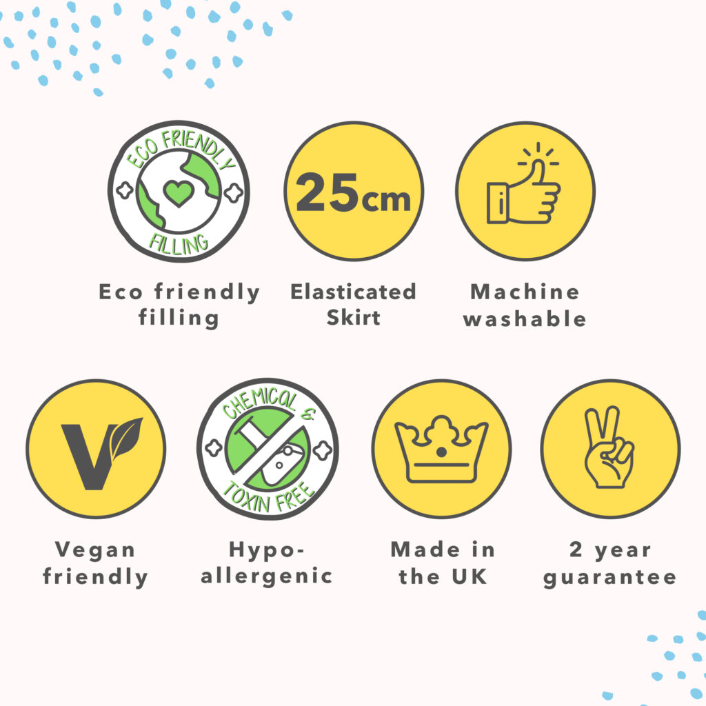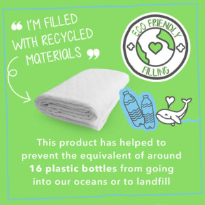 We’ve got you; your bedding is filled with 100% recycled content giving our lovely planet a helping hand. We care so you can be carefree, the squidgy fibres were once plastic bottles that have enjoyed a wonderful makeover.