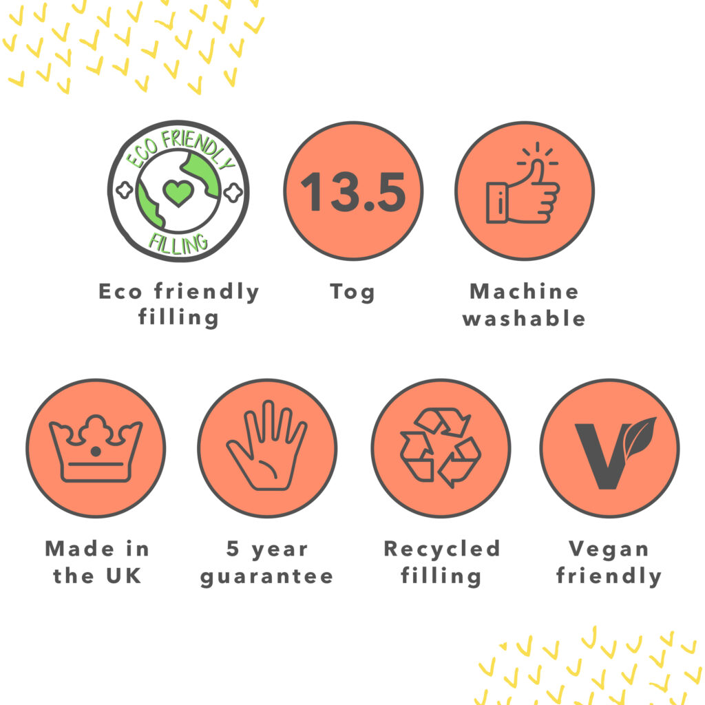 We’ve got you; your bedding is filled with recycled materials giving our lovely planet a helping hand. We care so you can be carefree, the squidgy fibres were once plastic bottles that have experienced a wonderful makeover. Our packaging is made from 30% recycled materials and can be fully recycled.